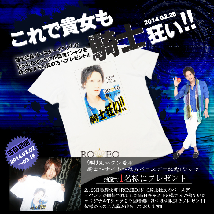 歌舞伎町『ROMEO』さんにて行われた騎士社長バースデーイベントの記念オリジナルTシャツを1名様にプレゼント!!