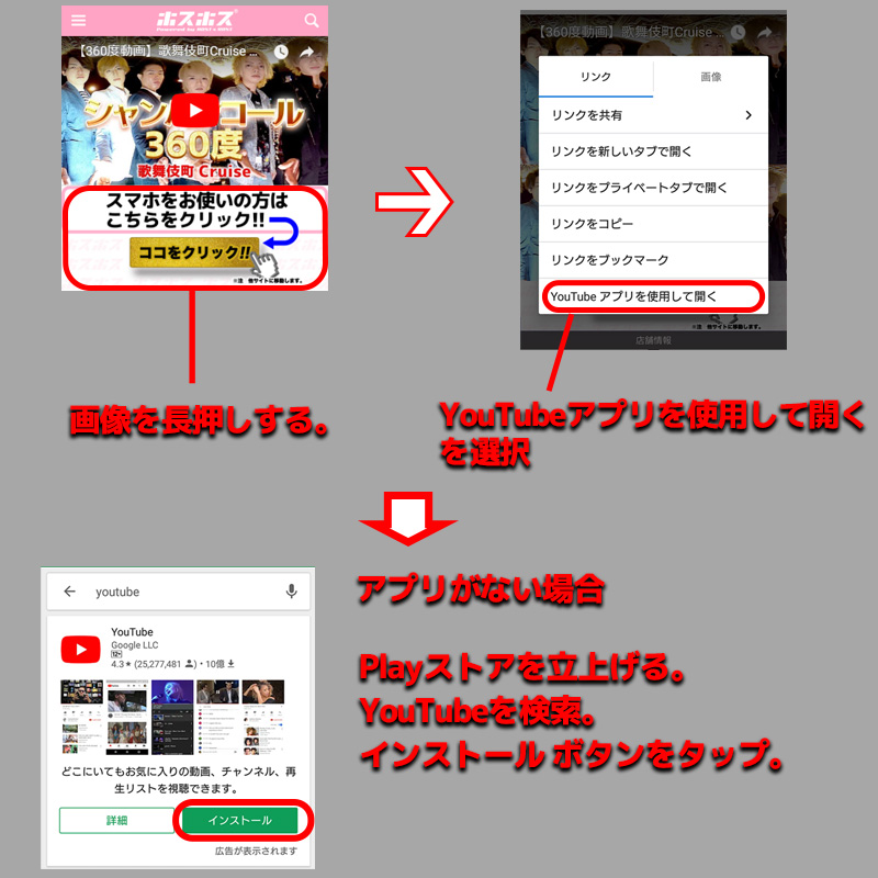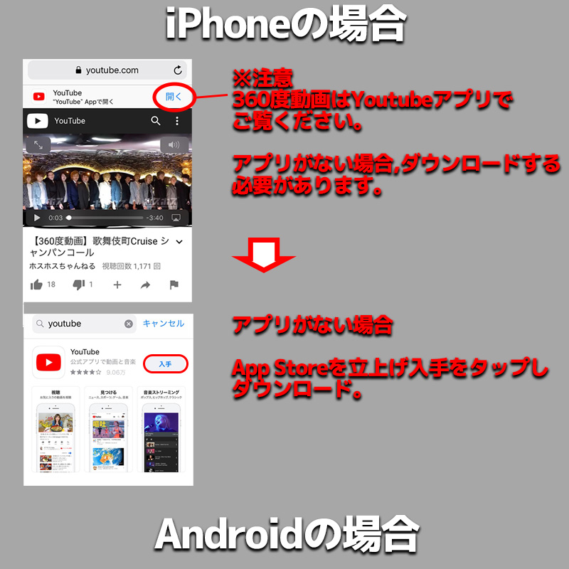 【スマホから見る場合】Youtubeアプリが必要になります。Android端末の場合、chromeブラウザであればブラウザ上で360度動画を見ることが可能です。
