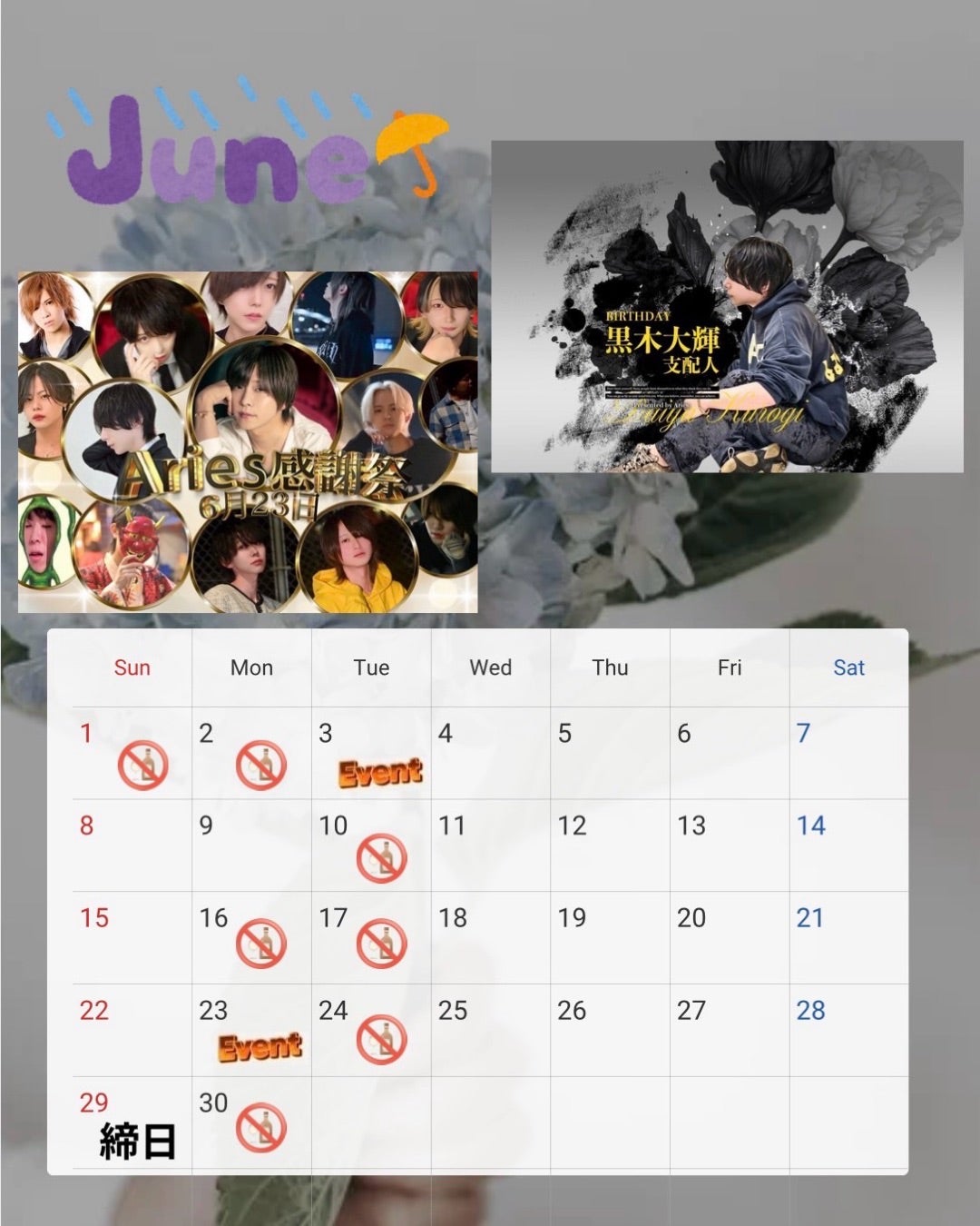 6月【🎪イベント告知🎪】6月3日 黒木 大輝支配人Birthday6月23日 Aries感謝祭【店休日のお知らせ】6月1~2日、6月10日、6月16~17日6月24日、6月30日、【締め日】6月29日【SNS】 -
