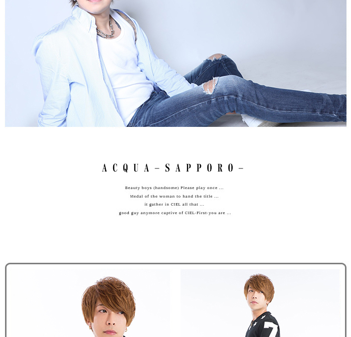 ACQUA SAPPORO輝咲真也Shinya Kizaki 誕生日:?月?日 (??才) / 身長:183cm血液型:A型 / 星座:みずがめ座イケメン度: / お笑い度: / お酒の強さ:- LINE: