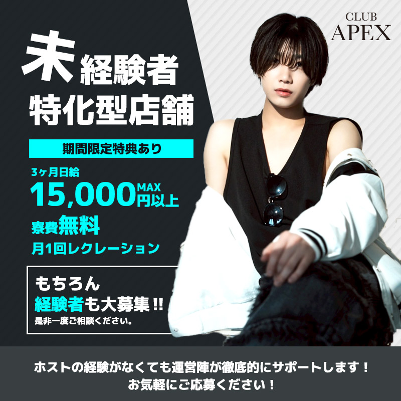 未経験者特化型店舗 ホストの経験がなくても運営陣が徹底的にサポートします! 当店ではホストを一度もやった事のない方 他店舗での経験はあるが売上を全く立てれなかった もしくは思うような結果が出なかった方 上記に該当するような方を大募集しています! 当店で輝かしい未来を掴みませんか? ◆◇◆◇◆◇◆◇◆◇◆◇◆◇◆◇◆◇◆◇◆ 期間限定特典 ・3ヶ月日給MAX15,000円以上 ・3ヶ月間小計100%バック ・総売上 50%~70%バック ・寮費無料 ・月1回レクレーション ◆◇◆◇◆◇◆◇◆◇◆◇◆◇◆◇◆◇◆◇◆ | |