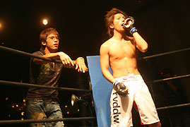 大会も終盤、セミファイナルに登場の『センス』祐聖!!セコンドには翼&智哉の2トップ!!