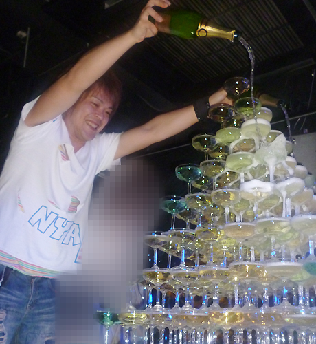 タワー完成まで、常時2本同時にシャンパンを注いでいくニャンニャ社長♪