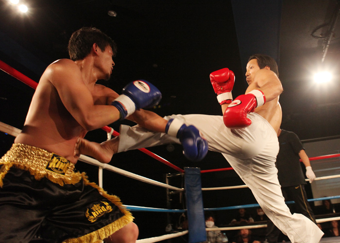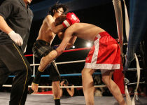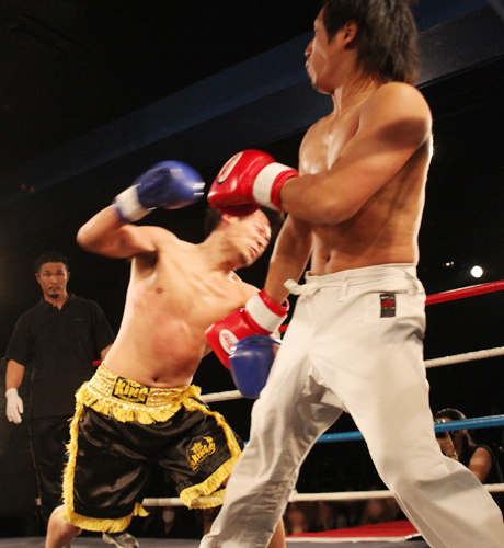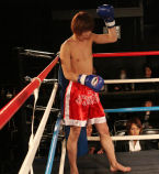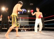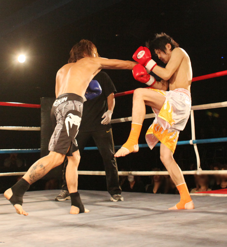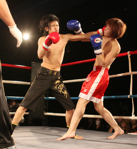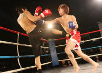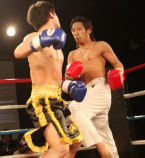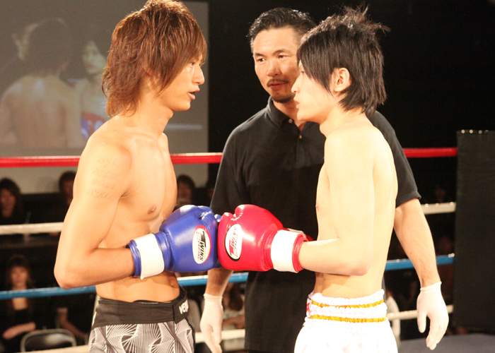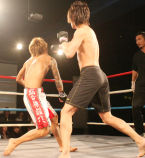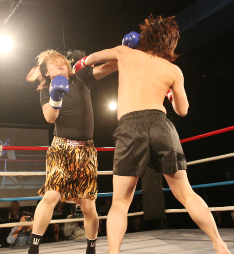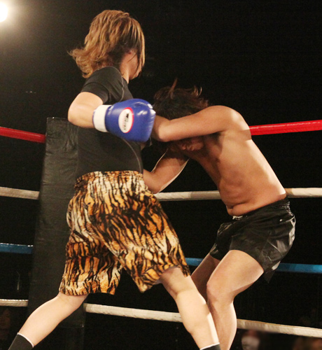 重いパンチが繰り返され、流血がおこるも決着がつかず2Rへと続きます!!2R、口火を切ったのは蓮選手!攻めが続きます。
