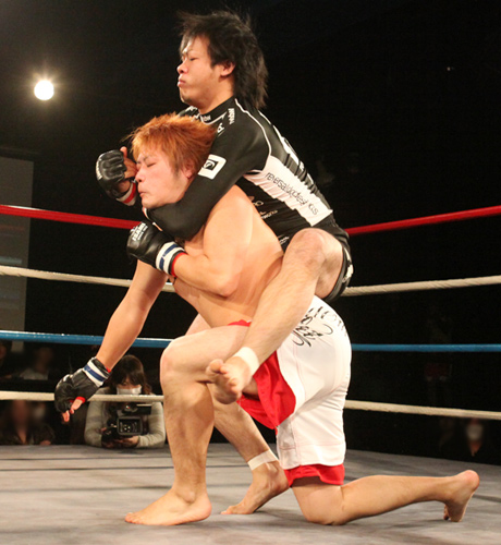 激しいぶつかり合いからスタート!!タックルから馬乗りになりレン選手の攻撃が続きます!