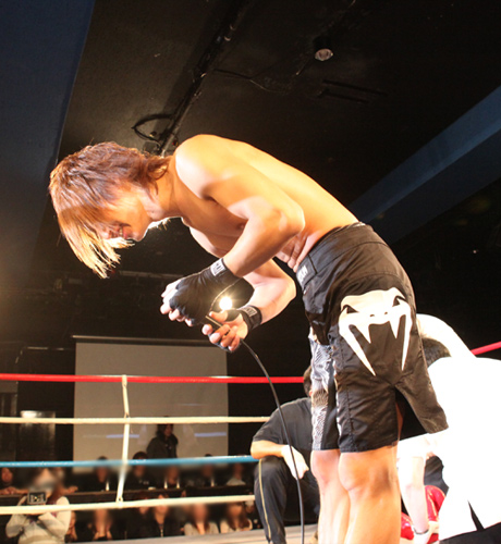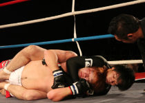 首を締め上げるが決まりきらず…再度攻撃へ転じるもレン選手からの攻撃から守りきった輝選手!!2Rへと続きます!