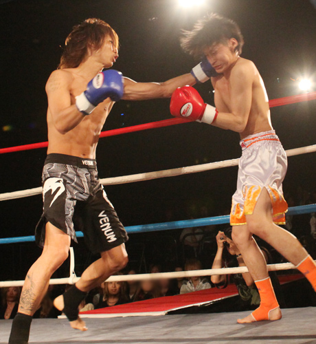 一歩譲らない試合展開に会場から歓声があがります!!もう1度ダウンを奪いたい幸之介選手…もう後がない尚斗選手…一進一退の戦いです!!