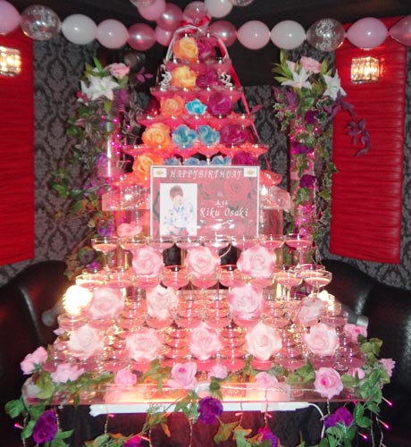 店内はピンクと赤い光に包まれていました!!シャンパンタワーも、まるでお花畑を連想させるような可愛らしいものが堂々とそびえ立っていました☆
