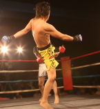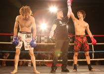 リョウヤ選手のキックを逆手に取り、翔桜選手がその足を掴み形勢逆転!!そのまま怒涛の反撃を見せ、1ラウンド2:05秒赤コーナー翔桜選手の一本勝ちでした!!