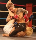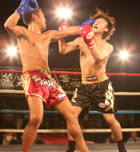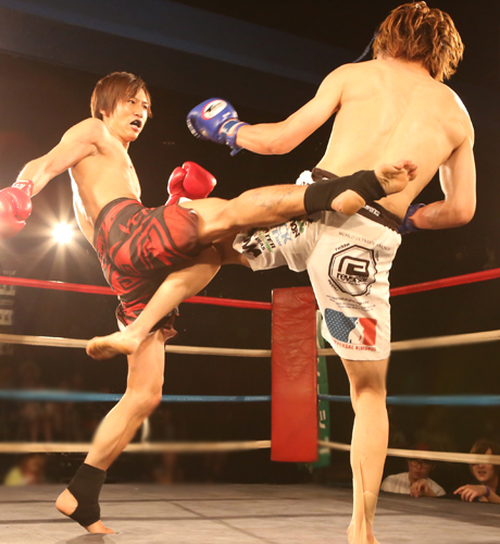 ゴングが鳴ると爽やかな鳴海選手の顔つきが戦う男へ変貌。一沙選手と白熱した攻防を繰り広げます!!
