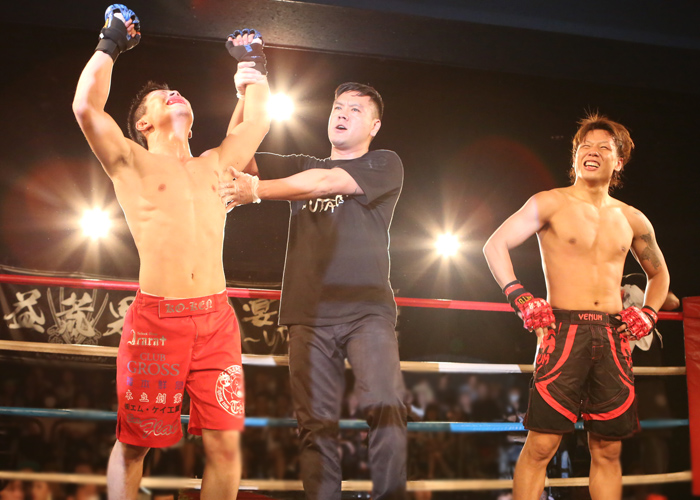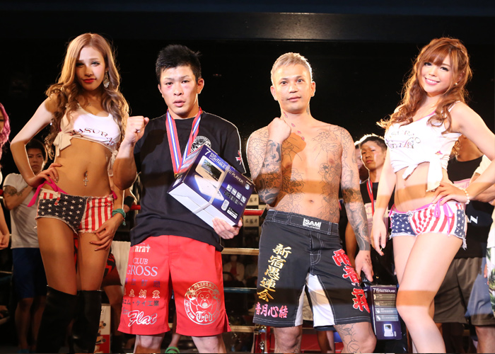 MMAルールともあり、寝技での攻防が繰り広げられ最後まで中々決まりません。時間内に決める事ができず…判定の結果、青コーナーKO-KEN選手の勝利が決まりました!!
