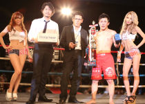70kg級キックルール王者・成宮 悠選手が誕生した瞬間です!!トロフィーを会場に駆けつけてくれた従業員の皆さんへ高らか見せつけ、まさに王者の貫禄そのもの☆