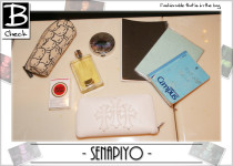 さっそく気になるかばんの中身を覗いてみましょう!!必要最低限の愛用品の中でもとってもキュートなポーチが気になりますよね☆