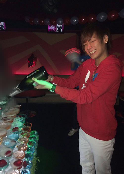 今夜のシャンパンタワーが始まり、司主任がキュートな笑顔で注いでいきます☆