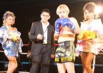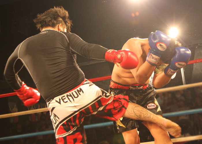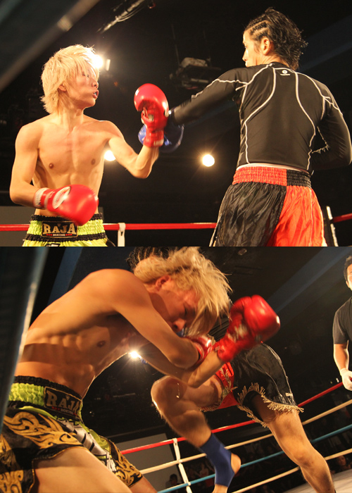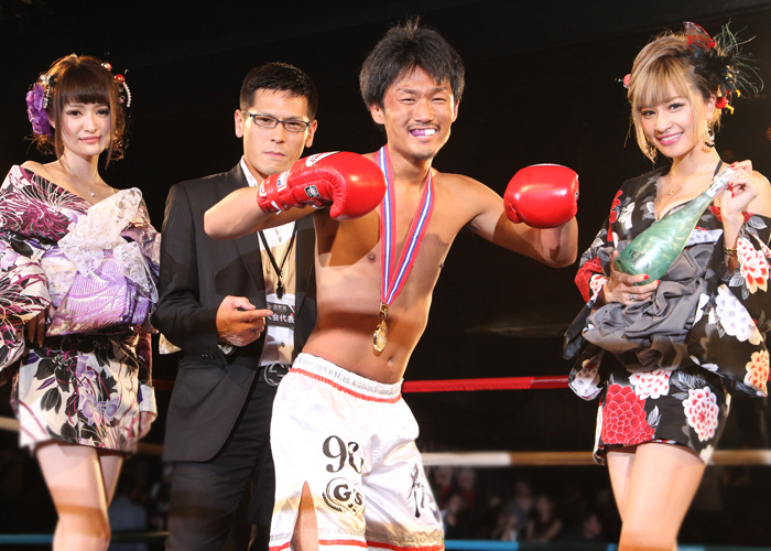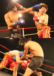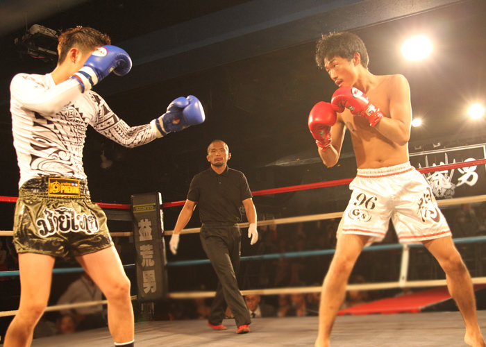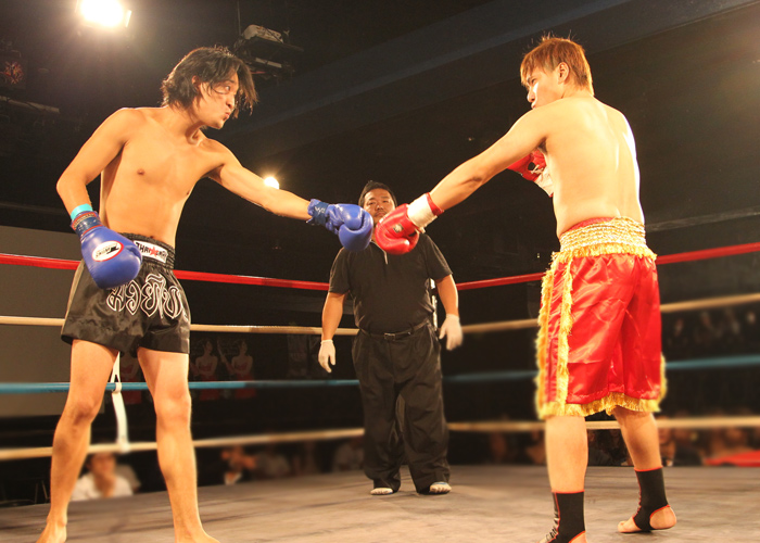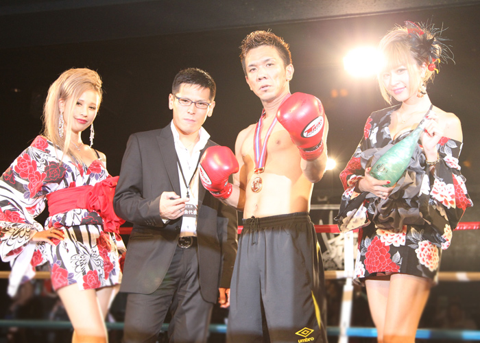 両者互角の戦いに判定へ。 赤コーナードイタカシ選手が勝利しました。