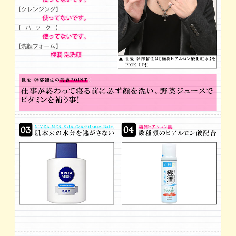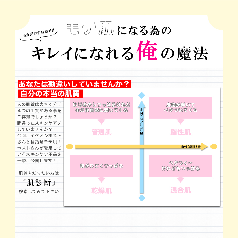 あなたは勘違いしていませんか?人の肌質は大きく分け4つの肌質がある事をご存知でしょうか?間違ったスキンケアをしていませんか?今回、イケメンホストさんと目指せモテ肌!ホストさんが愛用しているスキンケア用品を一挙、公開しちゃいます♪
