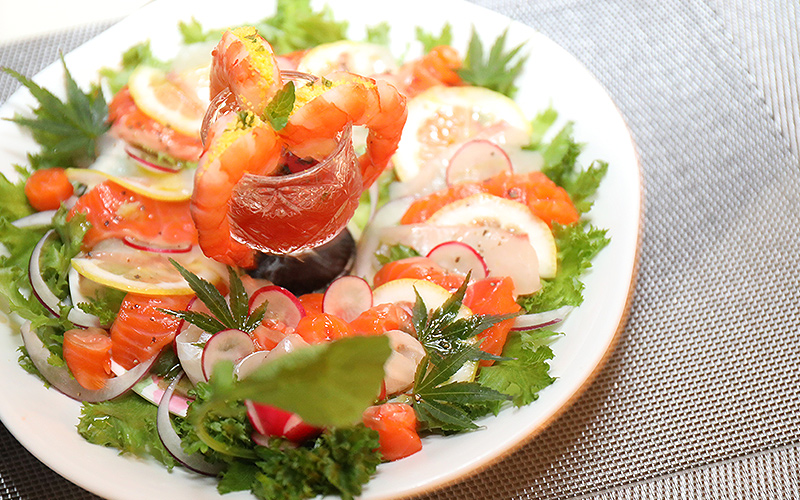 ■鯛とトラウトサーモンのレモン風味カルパッチョとエビのカクテルソース